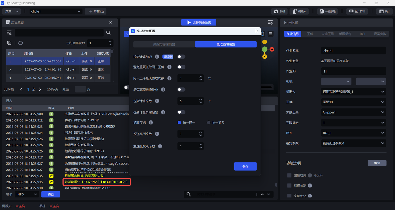 开启后,系统将保存作业运行的数据,其中机器人触发的数据会运用于工件模块下的视觉模型影子训练,优化模型识别效果。