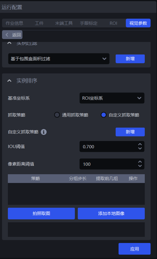 | 策略 | 选择依据哪个值进行分组排序以及如何排序,包括抓取点中心X/Y/Z坐标值从大到小/从小到大(mm)、从抓取点XY坐标轴向的中间到两侧/从两侧到中间(mm)可叠加多条,按顺序依次执行 |