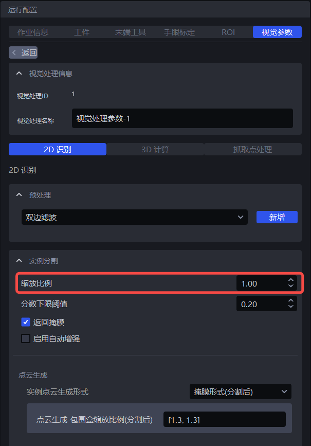 - 如果实际场景对抓取精度要求不高,可以在[0.2,0.5)区间内选择一个检测效果较好的缩放比例;如果实际场景对抓取精度要求较高,应当进一步细化缩放比例范围,按更小步长来调整,直至找到检测效果最佳的缩放比例。
