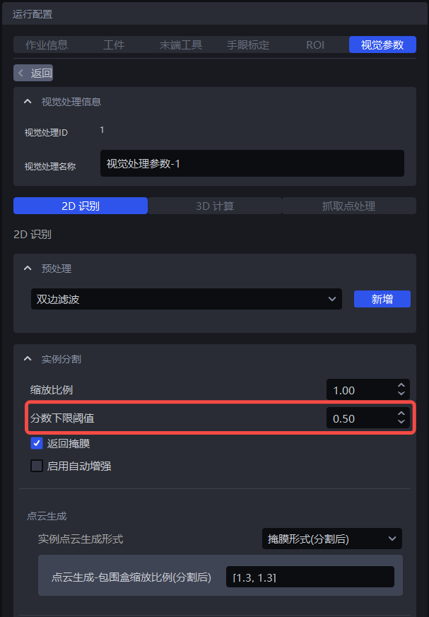 | 聚类点云数量 | 期望参与聚类的点数量,在ROI 3D区域内采样点云的数量 | 10000 | [1,10000000] | / | 聚类点云数量越多,模型推理速度下降而精度提升;聚类点云数量越少,模型推理速度提升而精度下降 |