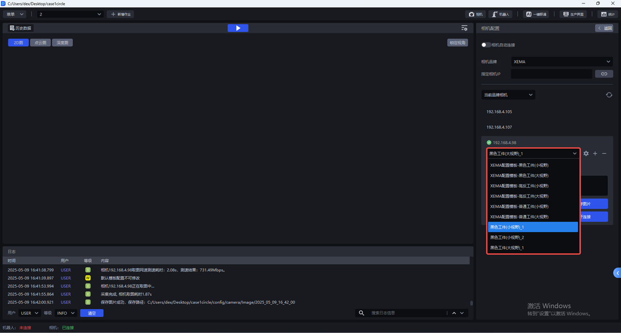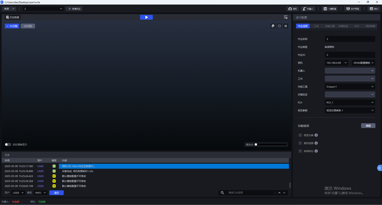 作业信息界面为当前作业选择相机,选择相机后,状态栏的相机连接状态变为"已连接",如下图所示。