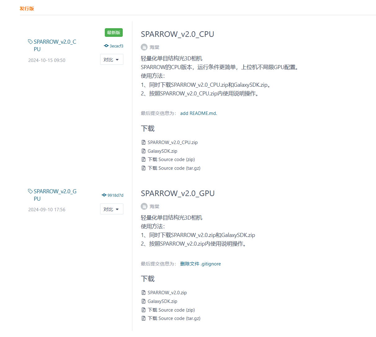 1)首次使用时,下载服务端安装包SPARROW_V2.0_C(G)PU.zip和大恒安装包GalaxySDK.zip,地址:https://gitee.com/open3dv/sparrow/releases (可根据电脑配置自由选择CPU或GPU版本下载)