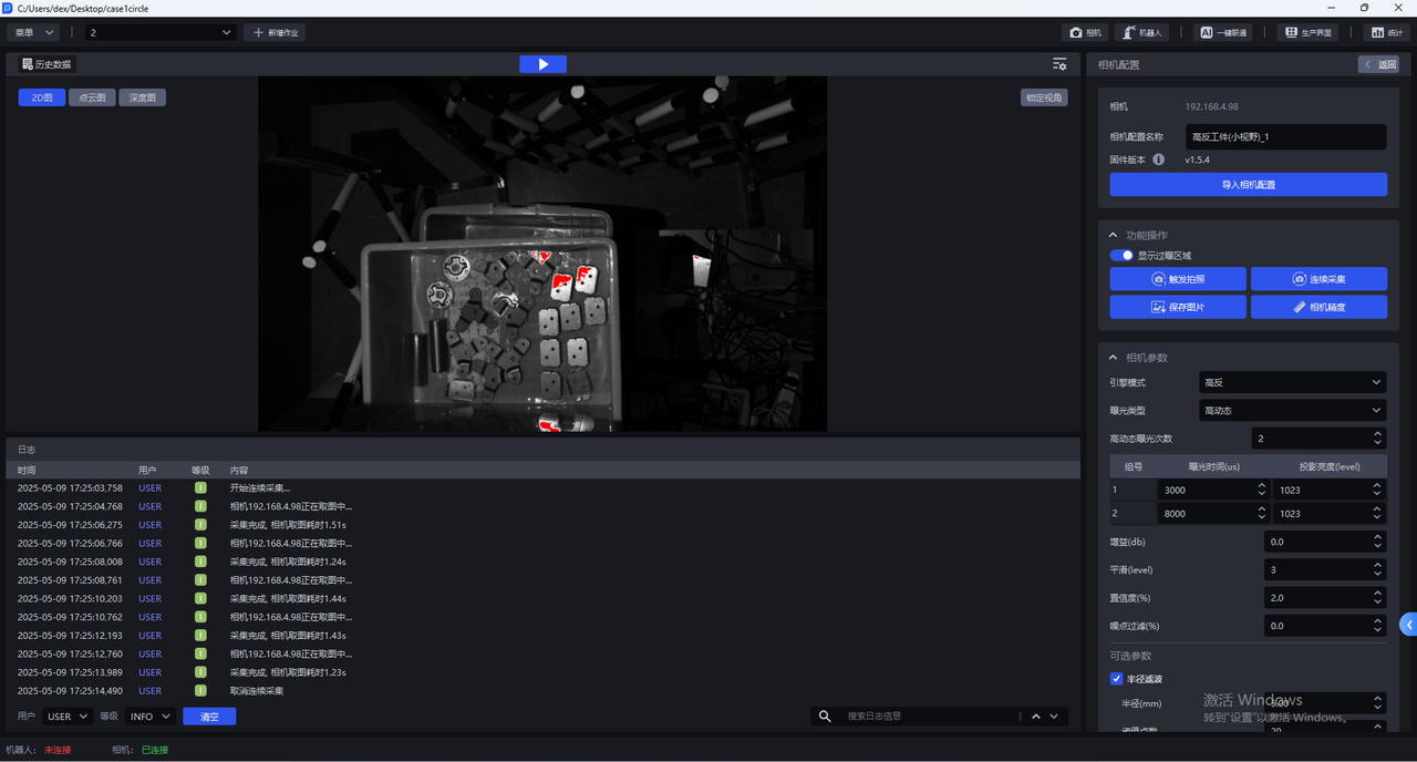 点击触发拍照,使用当前的相机配置拍摄2D图、点云图、深度图,可在可视化视窗查看当前相机配置的成像质量。
