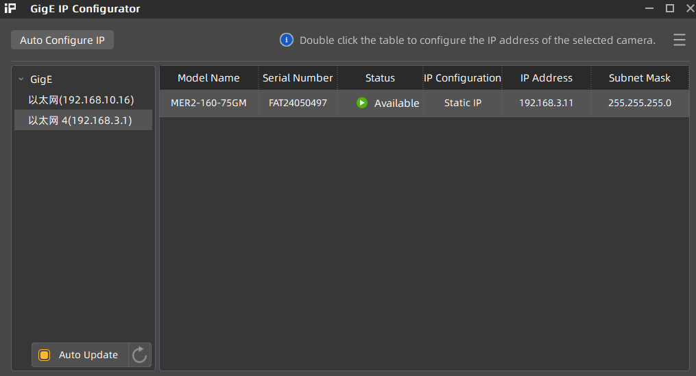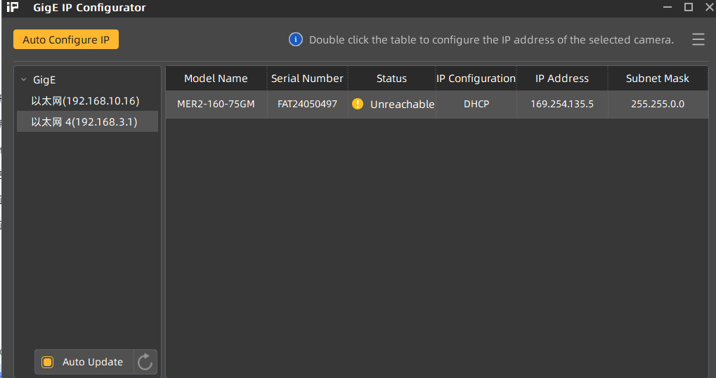 3)此时桌面会存在安装好的GxGigE大恒IP配置工具,双击打开,若发现IP为感叹号说明地址不在同网段,点击Auto Configure IP 按钮即可,若正常Available则不用点击配置