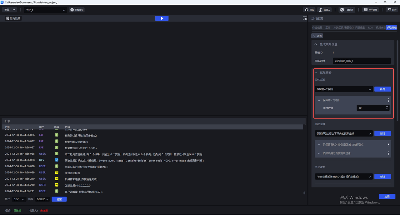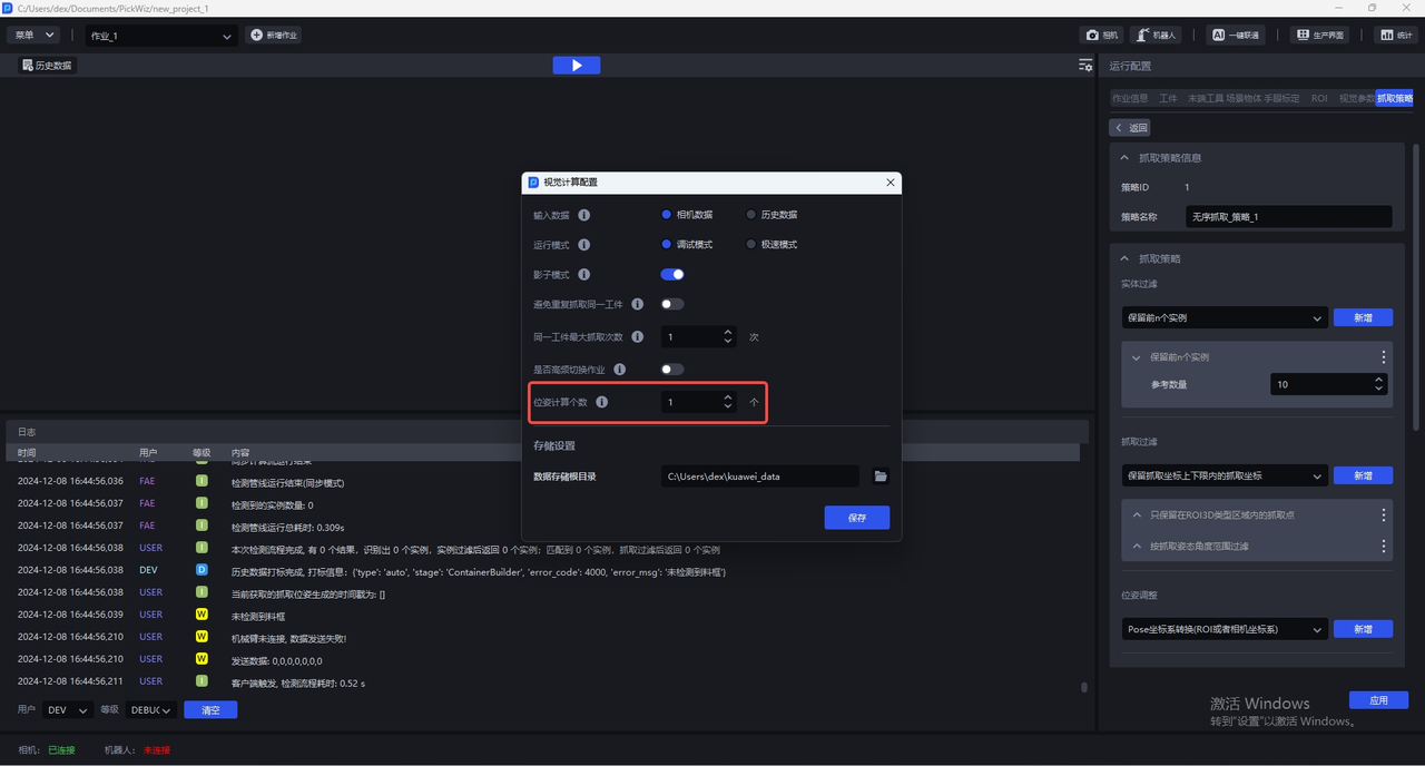 | 位姿计算个数 | 可是化视窗 - 视觉计算配置:![]() | 2D识别、排序、过滤后,实际会计算的位姿的实例个数,数值越大耗时会越久,各场景建议如下: