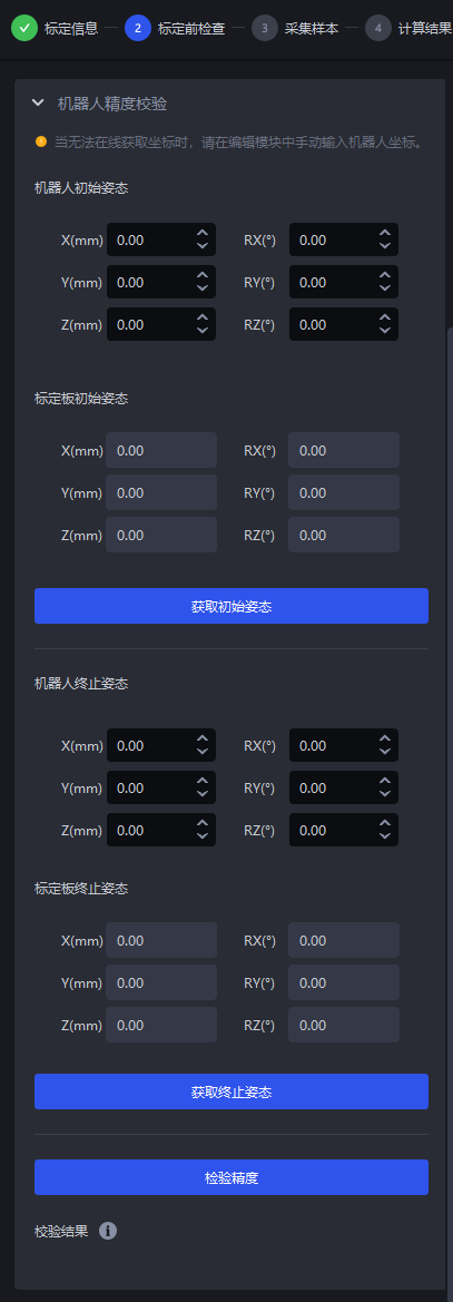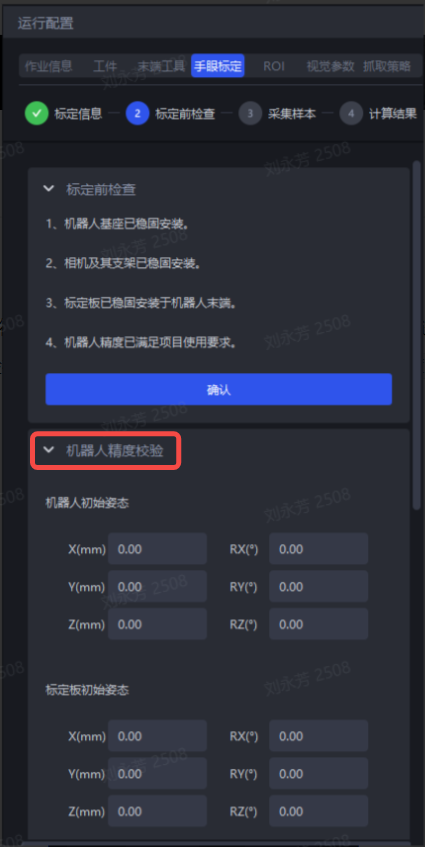 在标定前,需确认机器人精度是否满足项目要求,若不满足,需在标定前校验机器人精度;