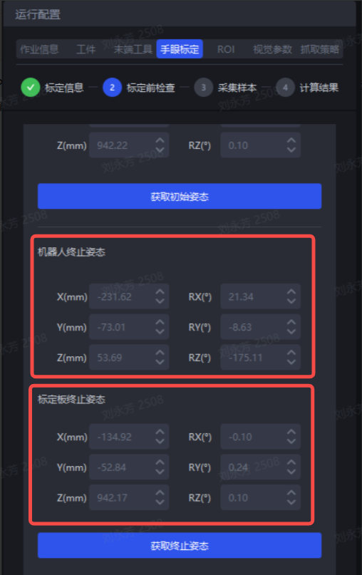 获取终止姿态,相机拍照识别标定板,标定板初始姿态会更新相应的标定板位姿。若相机拍照识别不到标定板,应当控制机械臂携带标定板平移,重新识别标定板。