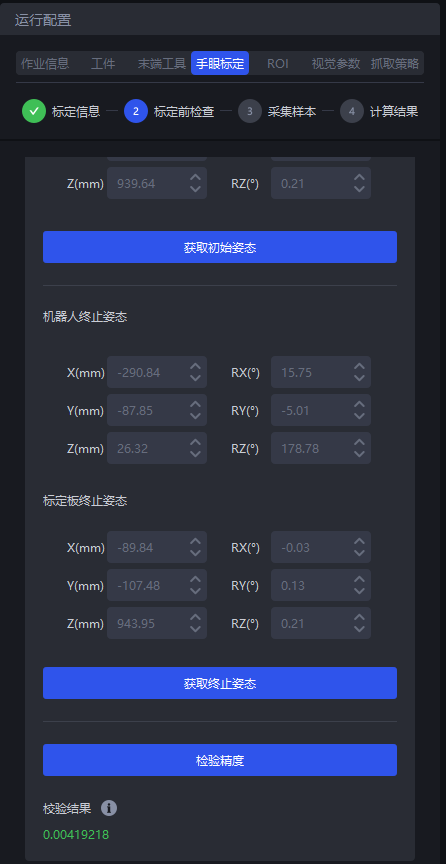 对于眼在手外的标定,校验机器人精度是在标定前检查阶段,打开机器人精度校验