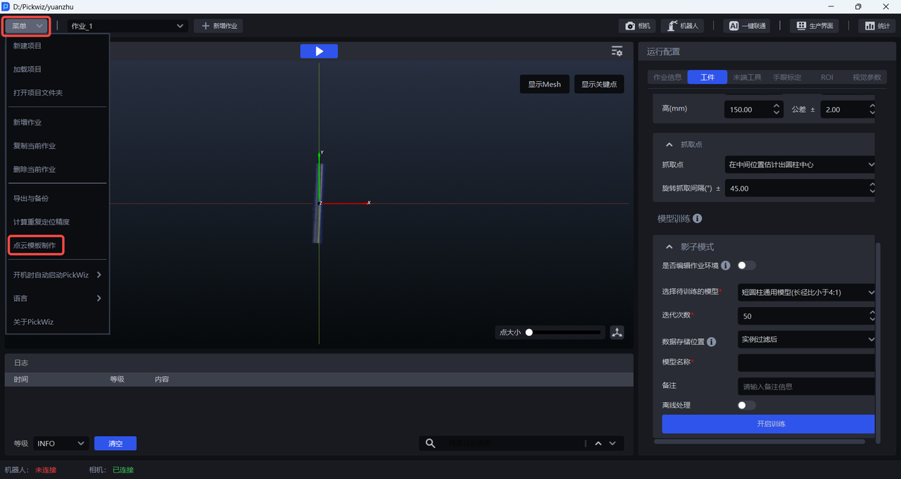 采集3D区域内的点云前必须连接相机并将相机配置到作业信息中,具体请参照相机连接与调参指南