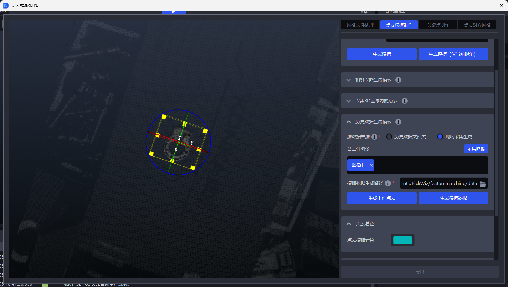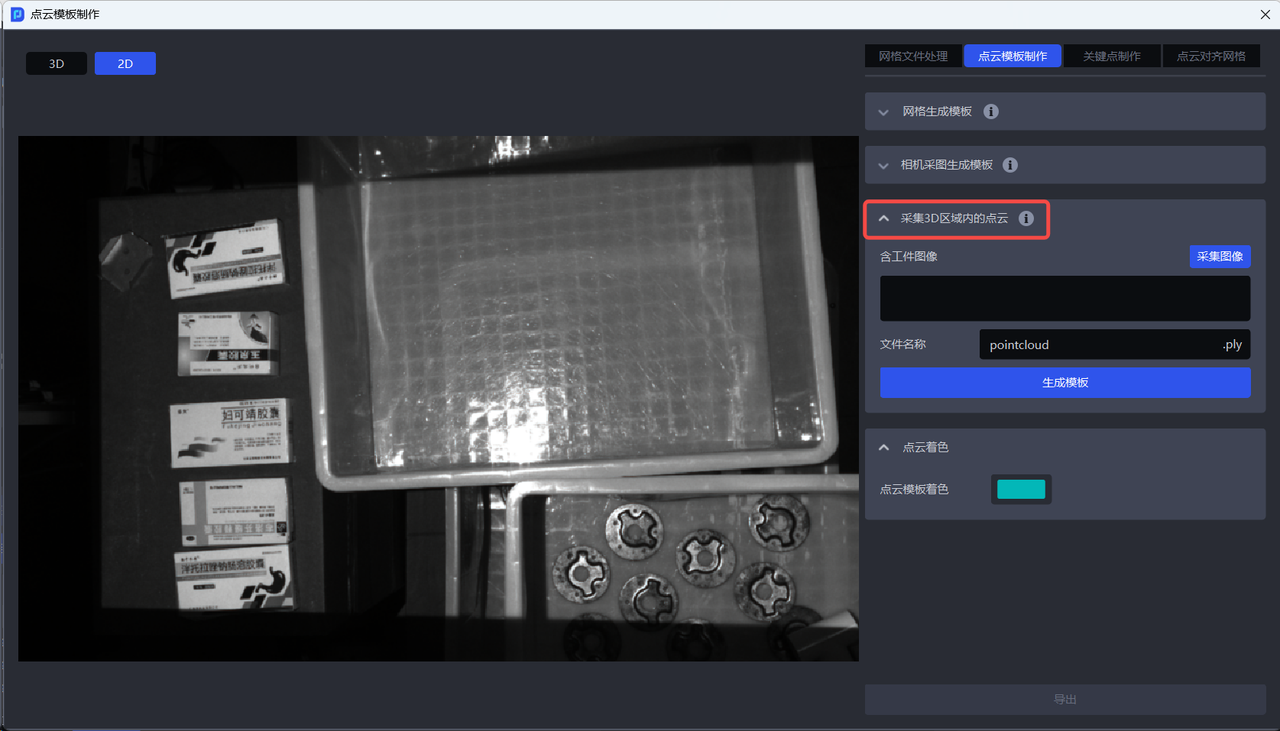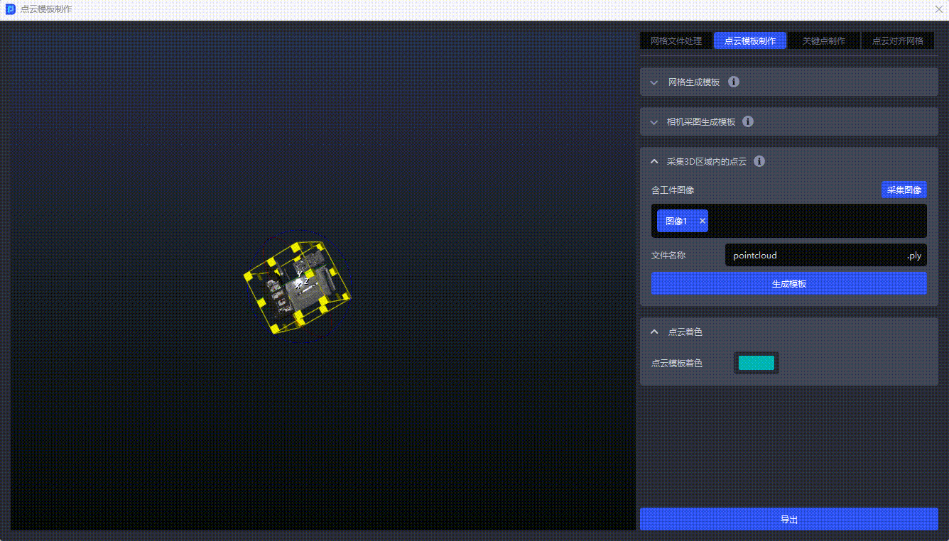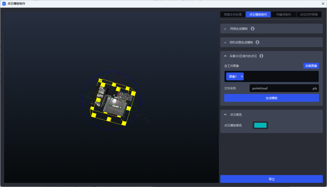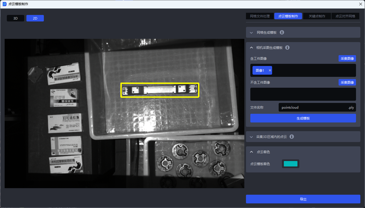 在相机采集的含工件的点云图中,用3D包围盒框选出工件点云,点击生成模板即可获取点云模板文件,如下图所示。