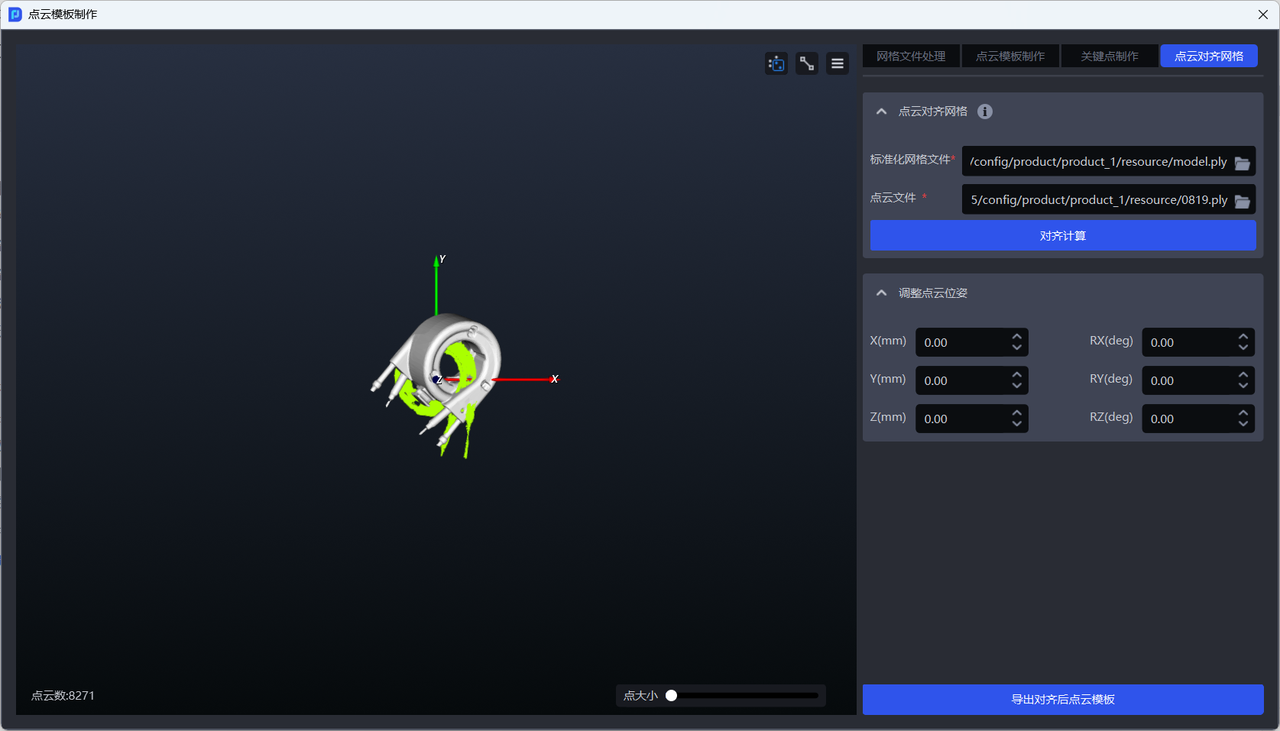 适用于通用工件场景,当标准化后的网格文件与工件点云模板坐标系不一致时需要(如通过相机采图生成的点云模板)使用该功能。需要对齐的原因为:相机采图生成的点云模板默认以相机坐标为原点,需要与标准化网格文件的坐标对齐,实现网格文件、关键点(通过网格文件生成,与网格文件坐标系一致)、工件点云模板的坐标关系一致,通用工件才可正常进行后续的识别与匹配。