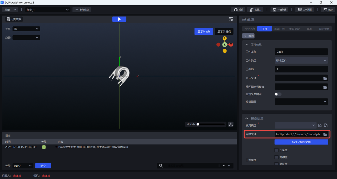 网格文件、关键点、点云模板均用于3D匹配,通用工件必须上传网格文件、点云模板、关键点文件,面型工件必须上传网格文件、点云模板,圆面工件、圆柱工件、四边形工件可能需要上传点云模板。