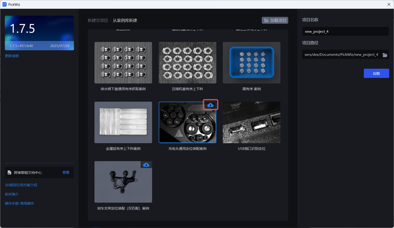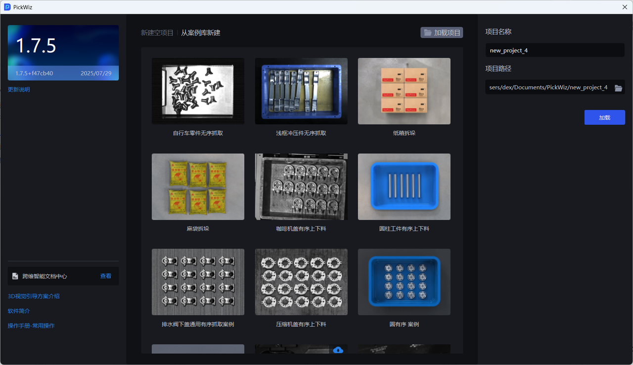 项目是 PickWiz 的核心工作单元,包括机器人配置与通信、手眼标定、视觉参数等多个功能和作业配置,为机器人完成抓取任务提供高效灵活的解决方案,满足麻袋纸箱拆垛、无序抓取、有序上下料、定位装配等多类型的工业场景需求。