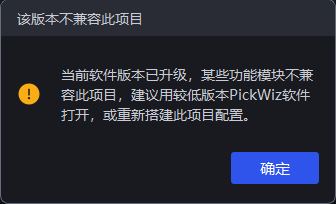 若打开项目时出现如下不兼容问题,请使用较低版本的 PickWiz 软件打开该项目,如有需要请联系跨维技术支持人员