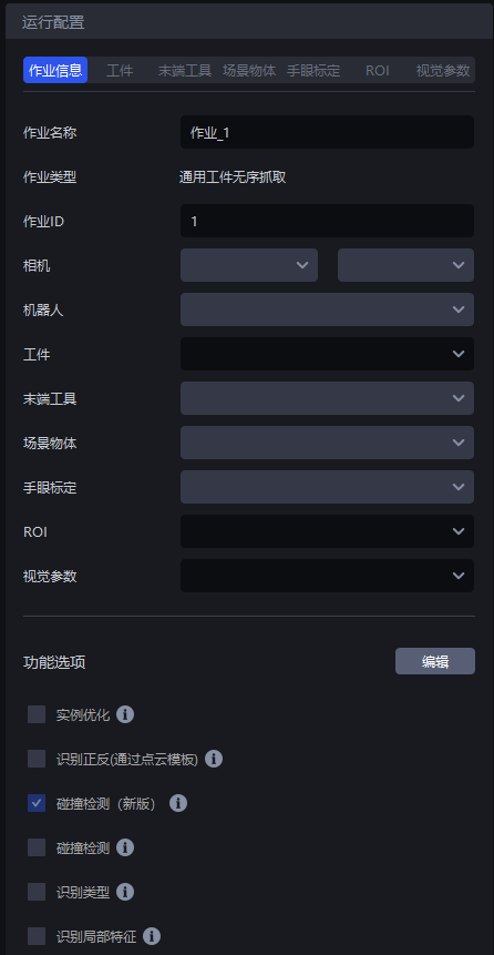 | 功能选项 | 点击"编辑",可选"碰撞检测"、"识别类型"、"识别局部特征"、"底托检测"等工况属性,选中和项目相关的工况属性,PickWiz 会根据选择的工况属性,匹配适配工况的功能配置,即在工件、视觉参数等相关配置中,添加选择的工况相关的配置。相关功能请查阅功能选项使用指南 |