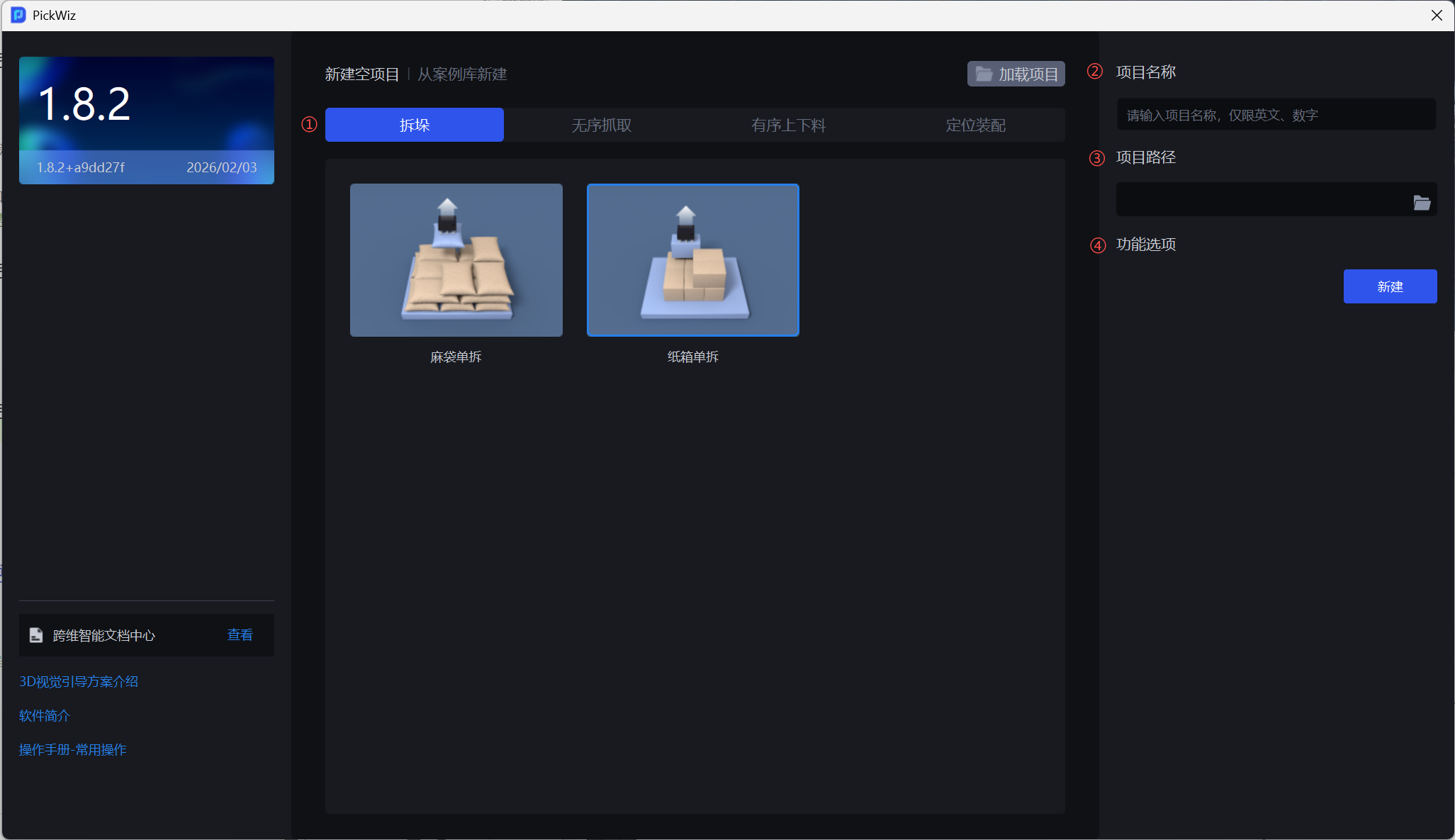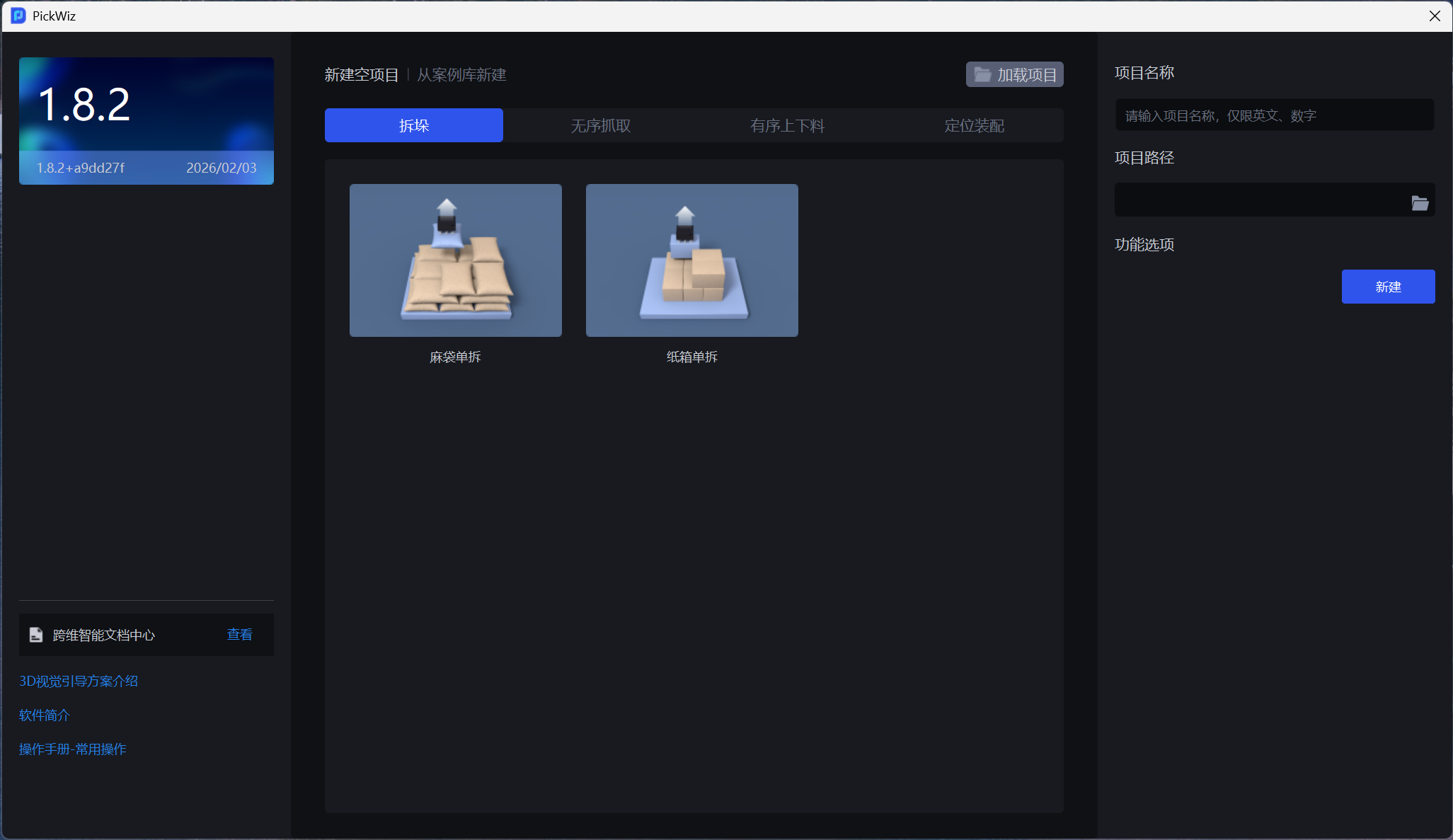 初次打开 PickWiz 软件,将进入欢迎页,如需新建空项目,请参照 1.1 新建空项目;