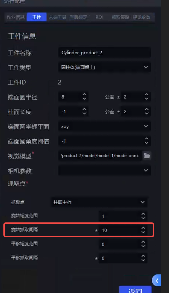 解决方案:减小圆柱工件属性中的旋转间隔,使得在圆柱表面一圈上,每隔一个较小的角度就有一个抓取点,这样的抓取点会更密集,也就是最垂直的抓取点跟ROI Z轴或相机Z轴的角度差会更小,如下图: