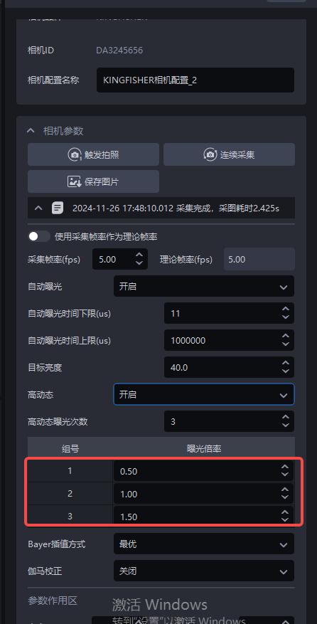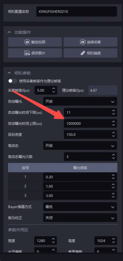 解决方案:使用自动曝光时间的上限可以控制单张图片的最大曝光时间(建议设置大于200000μs,即200ms,再低的话也不会提升帧率,最高帧率为5帧,反而损害图像质量),200000μs就是最快节拍了,算法会自动根据增益补偿亮度,整体效果不变,但是降低了取图时间,HDR模式下也可以通过这个参数控制最大曝光时间,进而降低HDR的整体时间。