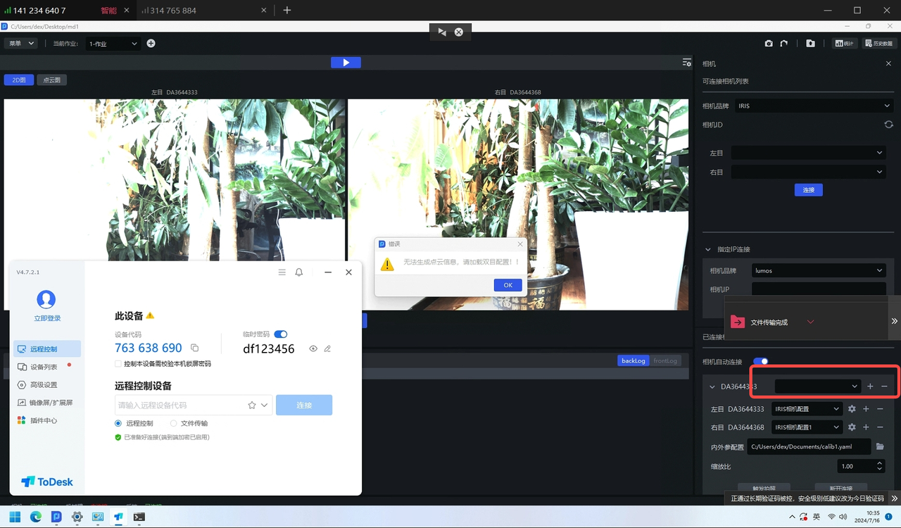 可使用MVS软件 连接双目相机,并开始采集 ,检查是否有弹窗提示丢包严重