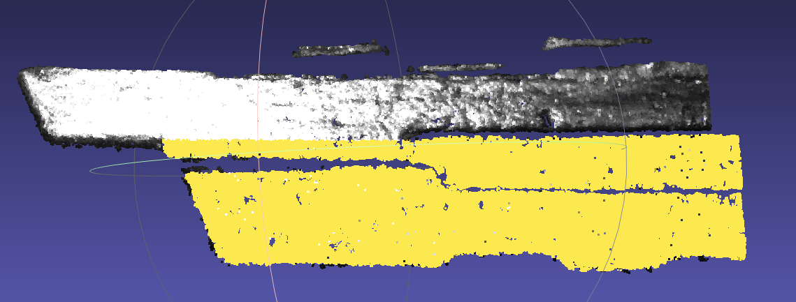 由于ICP的点对匹配特性,更多的点相似会将模版T型的头部在场景点云位置的左右进行“摇摆”,而T型尾部的管子主体无法有效的被场景点云“定住”,导致可能的偏差