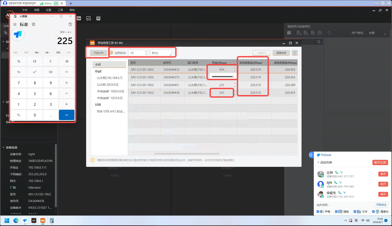根据使用的设备数量分配带宽:如4个相机需要同时使用,则设置相机带宽为900/4=225M;