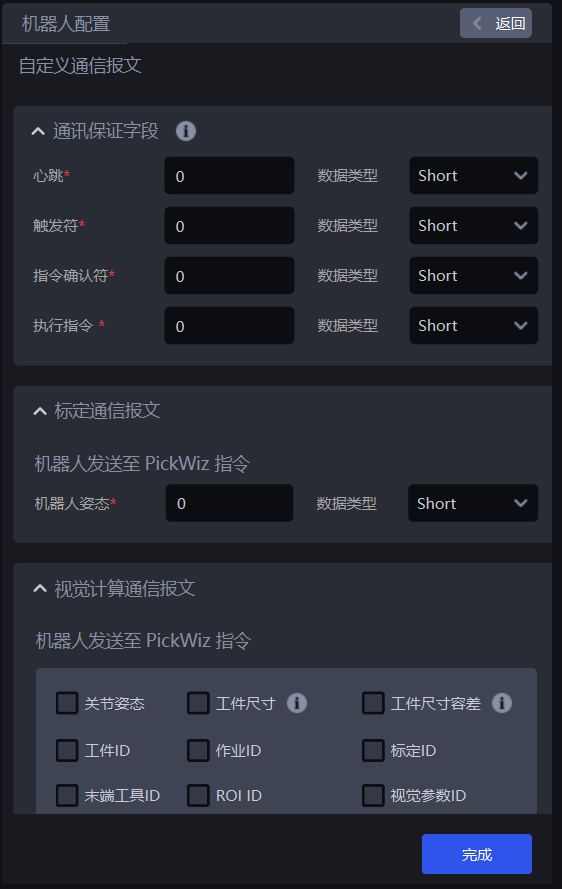 | 触发符 | 用于表示机器人/PLC是否触发指令。当机器人/PLC触发指令时,机器人/PLC向触发符地址块写入1,PickWiz 从触发符地址块中读取数据;当机器人/PLC收到PickWiz 接收到指令的信息后(指令确认符为1),机器人/PLC向触发符地址块写入0,以防机器人/PLC二次触发当PickWiz 执行完指令后,PickWiz 向机器人/PLC返回视觉检测结果,同时从触发符地址块中读取数据,若读取到0则机器人/PLC可以读取到返回的视觉检测结果 |