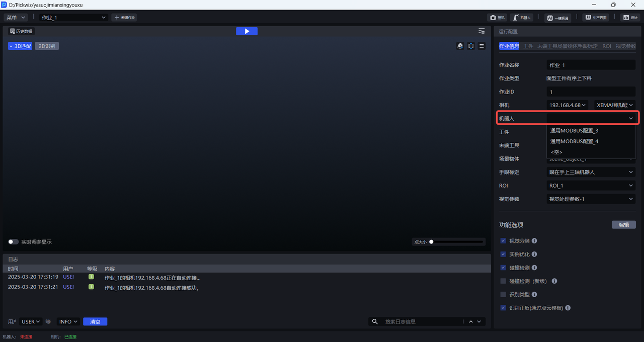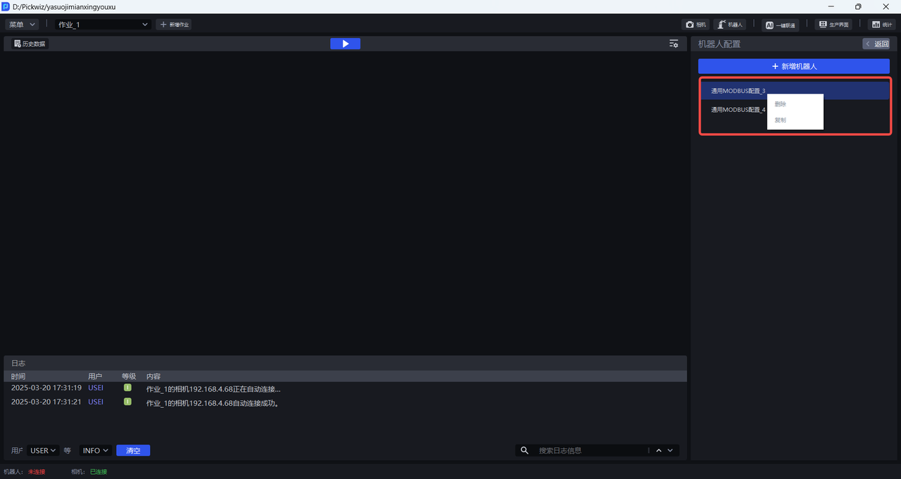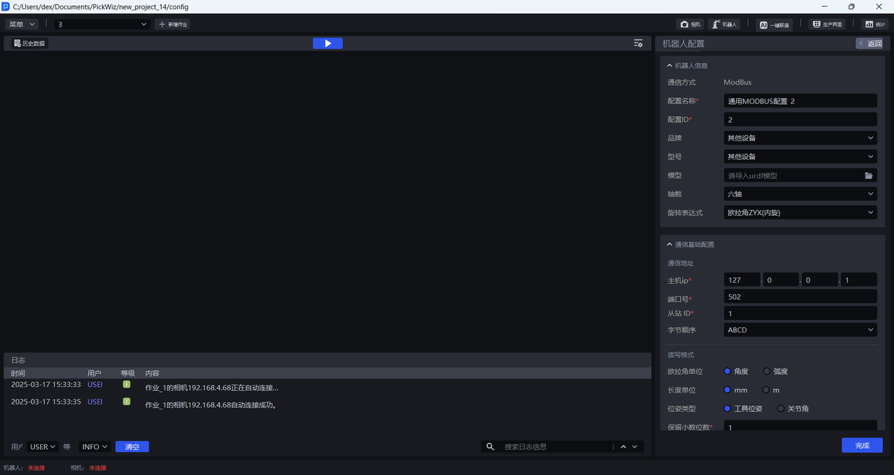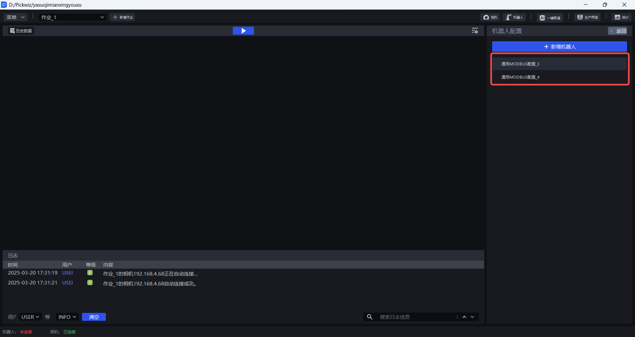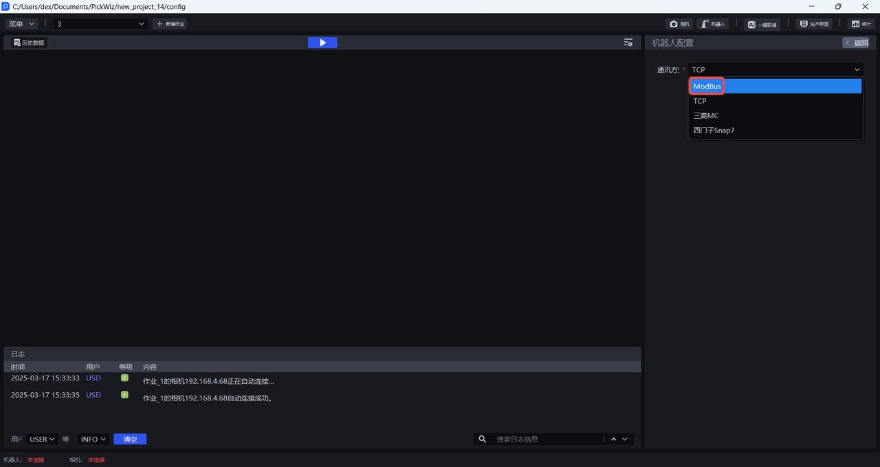 完成 ModBus 通信配置后,可在作业主界面为当前的作业场景选择机器人配置,在机器人配置选择栏选择相应的机器人配置,PickWiz 将尝试与机器人通过 ModBus 通信协议建立通信。