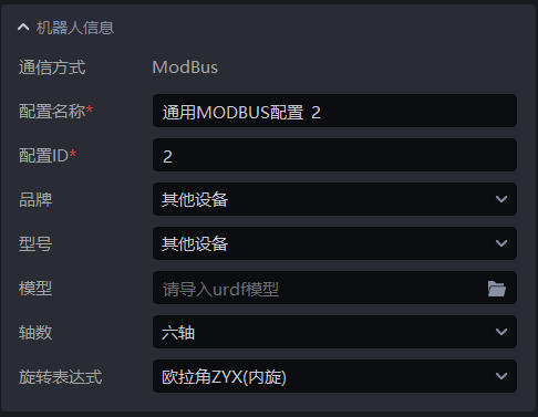 | 模型 | 品牌和型号选择其他设备时,需上传该设备的模型,模型文件的格式为urdf |