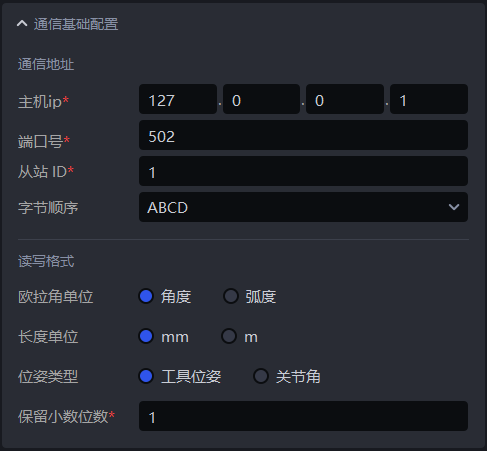 | 通信地址 | 主机ip | 主机ip地址,ModBus 通信方式下默认为127.0.0.1 |