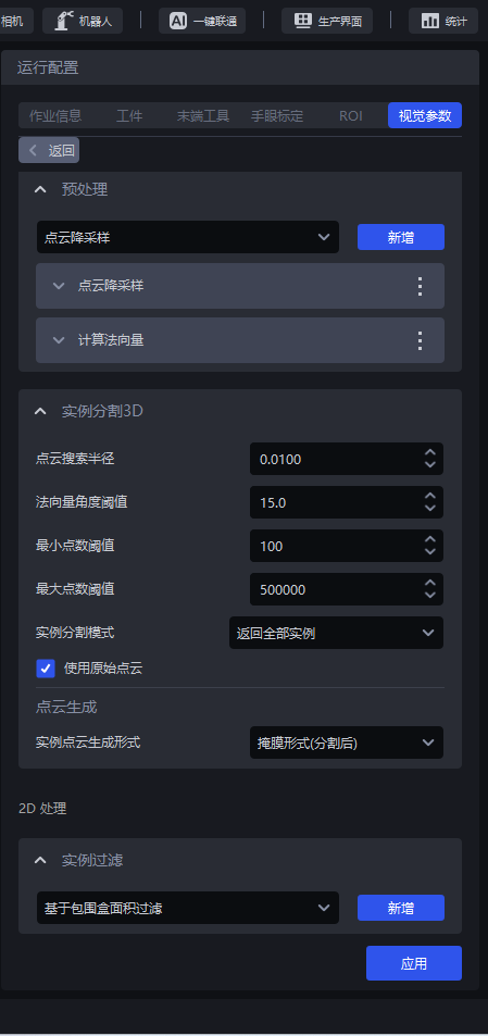 默认勾选,勾选该选项后,直接对前景点云进行分割,可保留工件更多特征;但勾选该选项后依然要对前景点云进行降采样,因此可以通过增大降采样点间距来优化节拍。