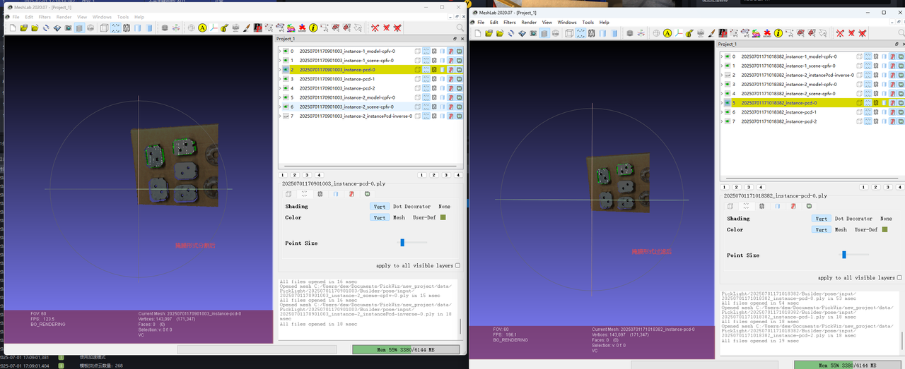 降采样的点间距取值越大,降采样后的点云数量越少,实例分割计算速度会加快,但精度可能下降