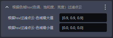 | 根据hsv过滤深度-色域最小值 | 过滤点云的最小颜色值 | [0.0,0.0,0.0] | [[0,0,0],[1,1,1]] |