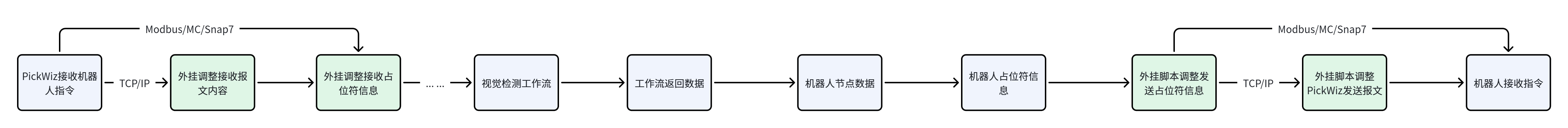 示例:当 PickWiz 收到机器人发来的简短指令码(比如示例里的 “210”“211” 这类短报文)时,通过外挂脚本里的pre_receive_messages_hook函数做解析处理,把短指令码直接替换成机器人能识别执行的、带完整参数的指令(比如把 “210” 换成 “d,0,0,0,0,0,0,1”),避免因短指令信息不全导致机器人无法响应或执行出错,快速适配现场机器人的指令交互需求。
